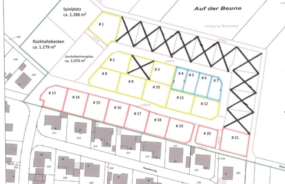 Nach der Freude kam die erste kleine Ernüchterung; das angebotene Grundstück (#4) war recht klein und es war zur Bebauung mit einer Doppelhaushälfte vorgesehen. Egal, frei nach dem Motto von Großvater Karl "lieber eine Laus im Pott als gar kein Fleisch" nahmen wir das Angebot an und machten uns an die Planung. Wir holten Angebote ein, verglichen diese (nach unserem ausgeklügelten Punktesystem) und standen kurz vor einer Entscheidung, doch dann hieß es plötzlich "Kommando zurück" denn sehr zu unserer Freude bot die Stadt uns dann doch ein größeres Grundstück (#18) für ein freistehendes Haus an.