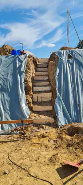 Es war am Montag dem 11.09 als klar wurde, dass wir auf jeden Fall eine Art Treppe oder Rampe brauchen würden und der Termin für die Bodenplatte bereits am Montag drauf ist. Unser Tiefbauer hatte mir erklärt er habe keine Zeit mehr diese Woche und so blieb uns nicht Anderes als die Dinge selbst in die Hand zu nehmen und ihnen eine Treppe zu bauen….eine Treppe so schön wie sie noch nie ein Mensch gesehen hat…….eine Treppe so…also bekommen haben sie diese hier.